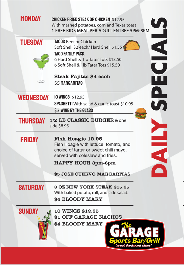 The Garage Sports Bar & Grill has been proudly serving the Lincoln community for over 15+ years, with new ownership in September 2023. We are a full-service restaurant dedicated to providing the best quality food and drinks at affordable prices. With 22 TVs it is the perfect place to come watch your favorite game. We offer a variety of beers on tap with rotating seasonal beers, Happy Hour Monday through Friday 3 pm-6 pm, Daily Specials, and Lunch Specials Monday through Friday 11 am-2 pm. The venue also features outdoor patio dining with seating for over 80 guests, making it an ideal spot for enjoying great food and good company. Our Event Room is the perfect place to book your next party or event, accommodating up to 100 guests. We also offer Catering! Please ask or call for our catering menu. Come enjoy Live Music every Friday night! On Tuesdays, we have live Trivia in the cooler months and we switch to bands on the patio in warmer weather. We offer multiple skill games, Keno, and darts.